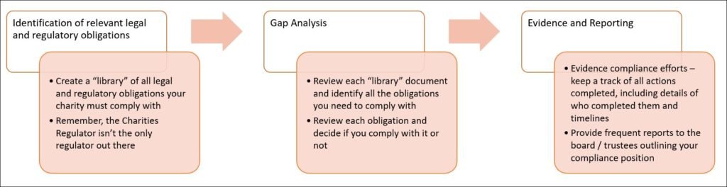 Our suggested approach, outlined in the diagram below, starts out with identifying all the relevant legal and regulatory obligations. When doing this, you may need to think broader than just the Charities Regulator. For example, the General Data Protection Regulation (GDPR) is probably a concern, and some charities may have requirements from the provision of certain of their services that might make the likes of HIQA or Tusla regulations relevant. If you raise funds from the public, you will also need to review the Charities Regulator’s guidelines on this and consider how you comply with it. too.